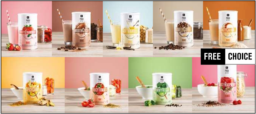 Batidos LR FIGUACTIVE – Smooth Cocoa, Fruity Strawberry, Soft Vanilla, Lovely Coffee, Tasty Caramel.